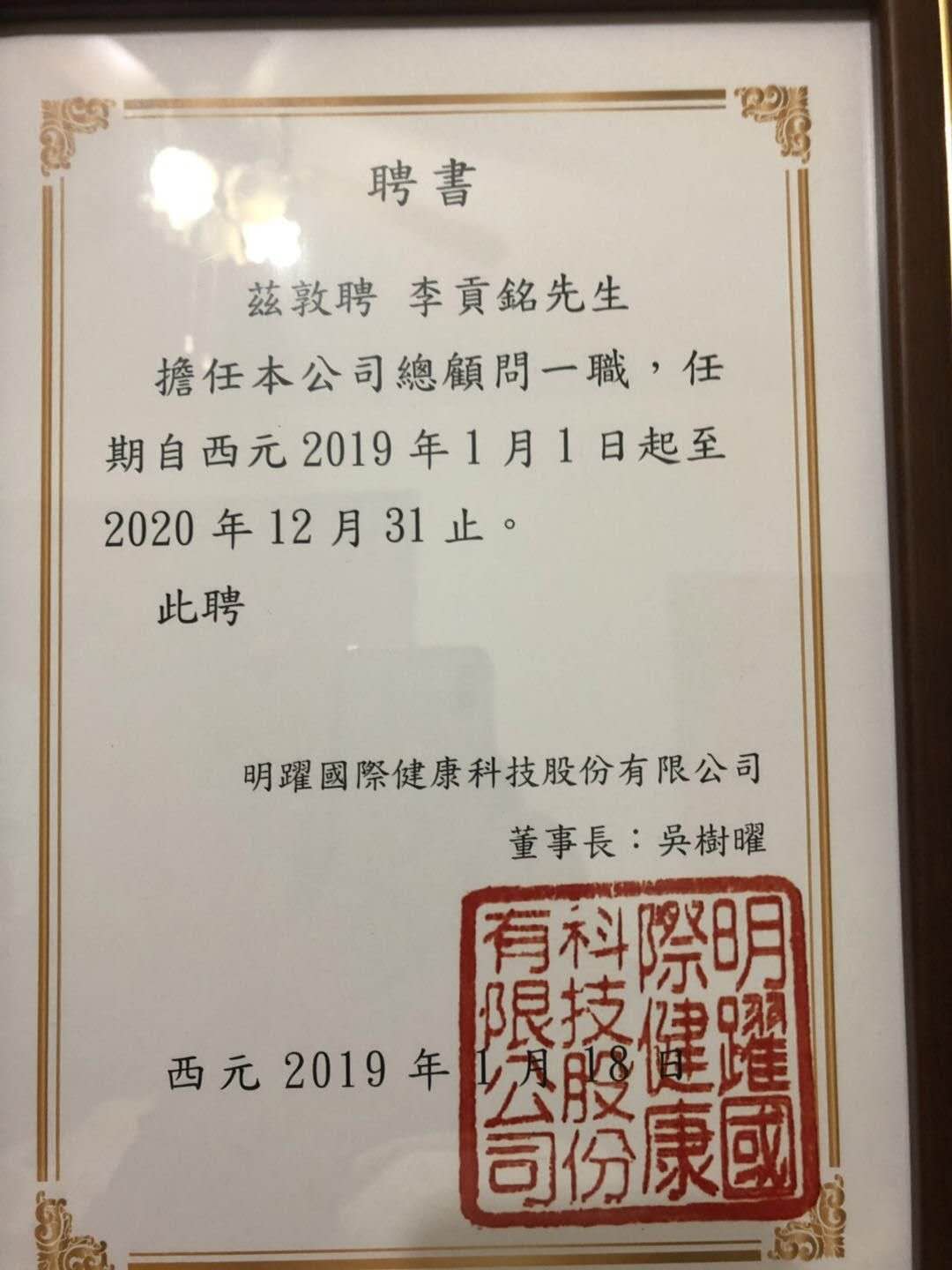 明躍董事長吳樹曜先生聘為總顧問一職